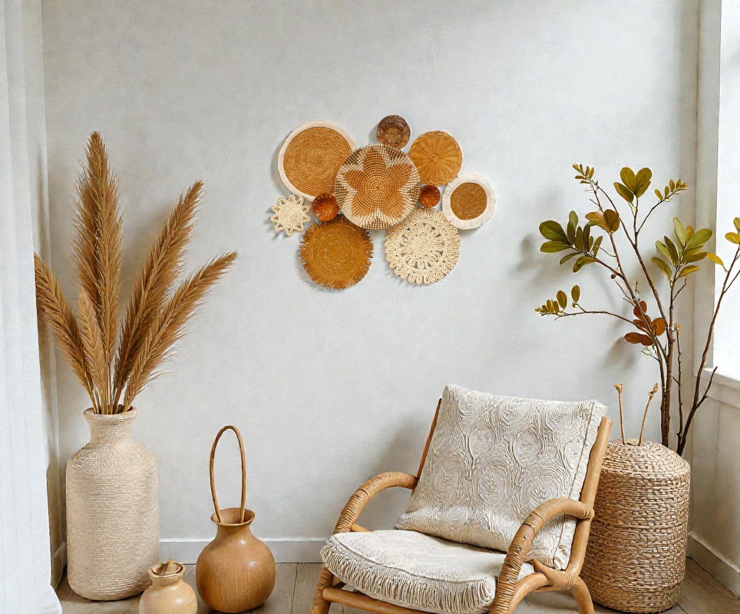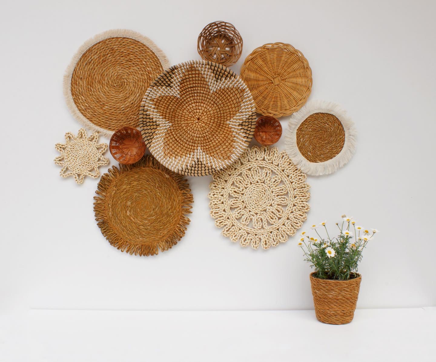 El yapımı sepetlerden oluşan bir duvar panosudur. Ürün, doğal malzemeler ( hasır, rattan vb.) kullanılarak üretilmiş farklı boyut ve desenlerdeki sepetlerin bir araya getirilmesiyle oluşturulmuştur. Modern ve bohem tarzlarda ev dekorasyonu için oldukça şık ve dikkat çekici bir parçadır. Set 10 parçadan oluşmaktadır. Ürünler ayrı ayrı gelmekte olup istediğiniz gibi dizayn edebilirisniz.