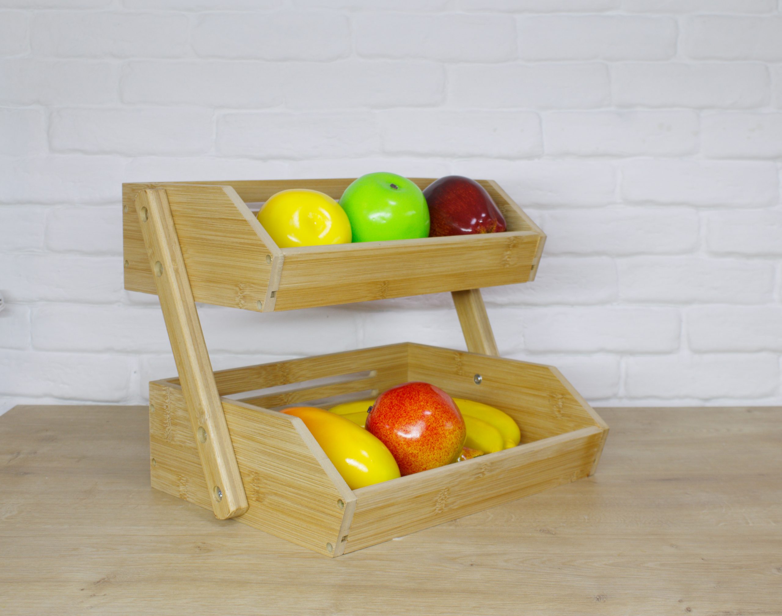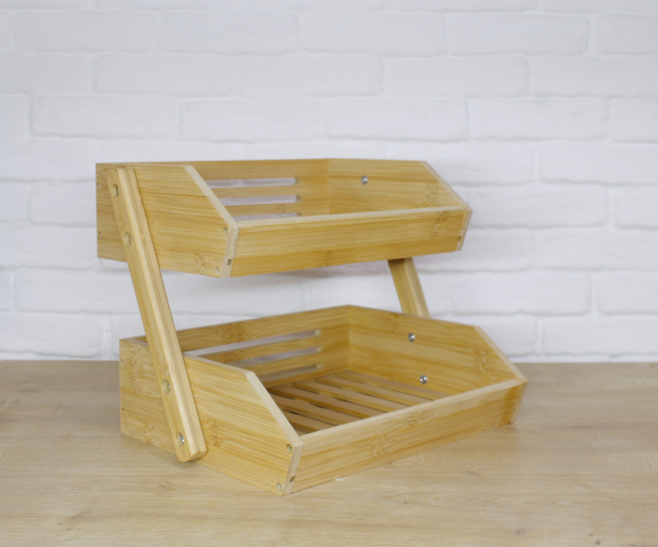 Mutfakta düzeni ve şıklığı bir arada sunan 2 katlı bambu organizer, tezgah üstü sebzelerinizi, meyvelerinizi ve ekmeklerinizi estetik bir şekilde sergilemenize olanak tanır