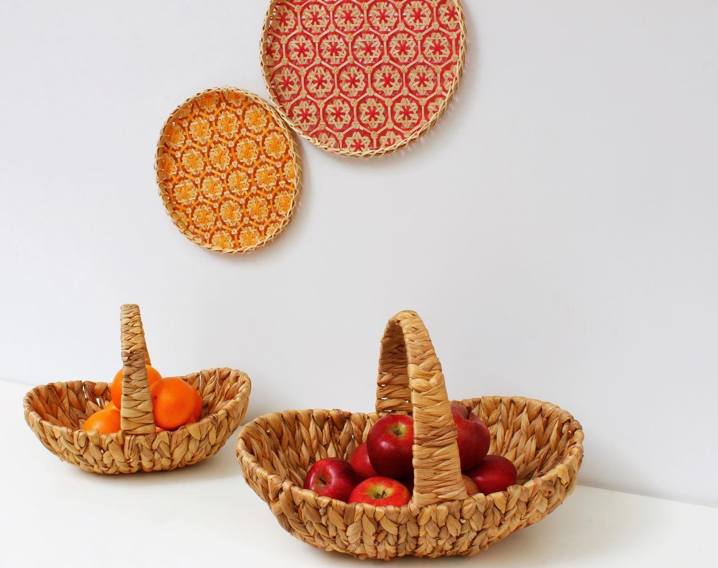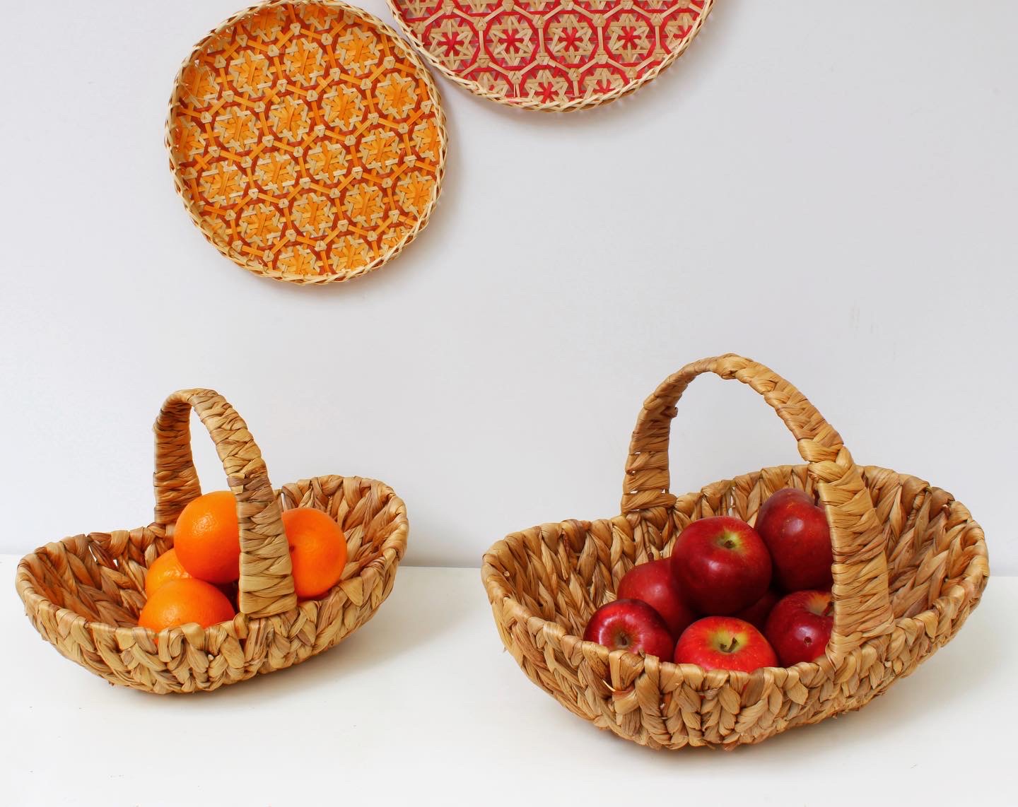 Doğal malzemelerden el işçiliğiyle üretilen hasır kulplu sepetler, hem şık hem pratik bir depolama çözümüdür.